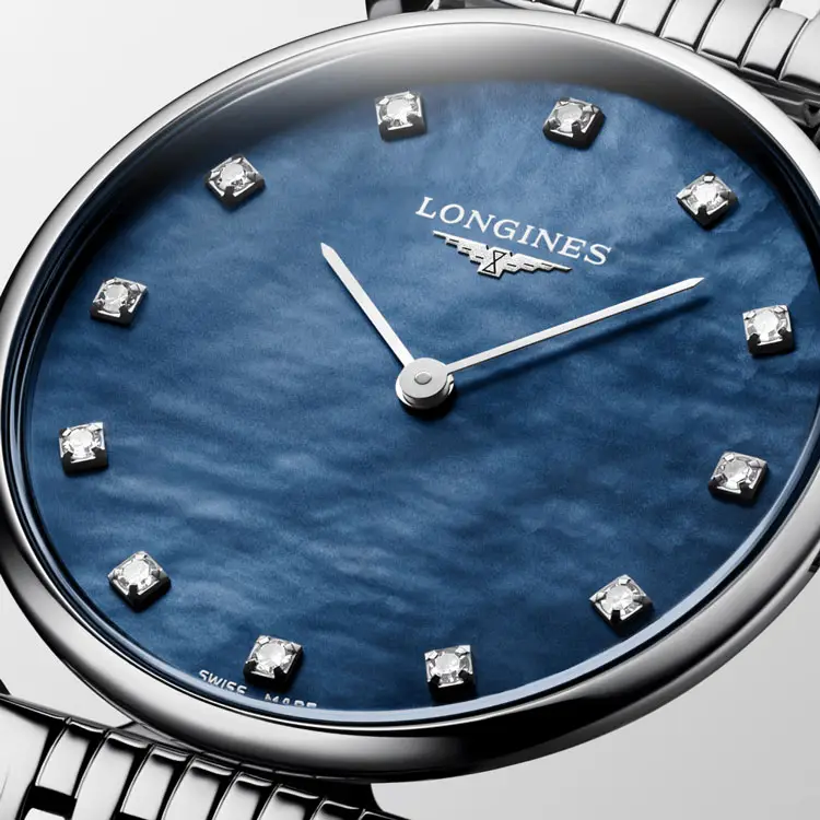 Циферблат из синей перламутровой массы украшен 12 бриллиантовыми метками, которые придают часам деликатное сияние и изысканный блеск. Минималистичные стрелки подчёркивают чистоту дизайна, делая эту модель универсальной как для повседневной носки, так и для особых случаев.