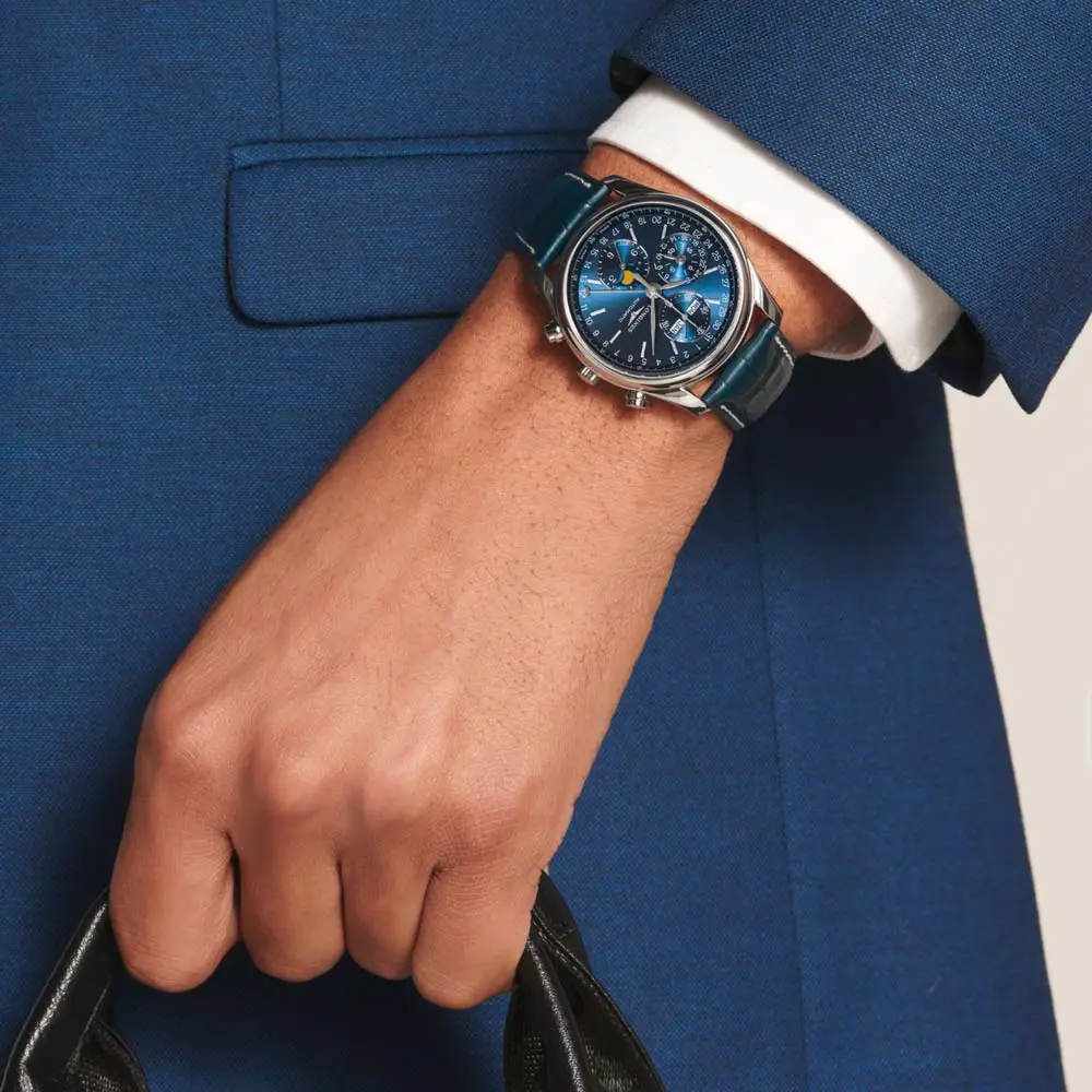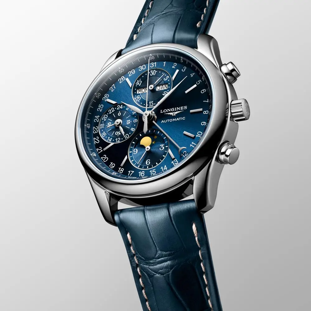 Внутри установлен автоматический калибр L687 с запасом хода до 66 часов, обеспечивающий точность и надёжность. Водонепроницаемость до 30 м (3 ATM) и ремешок из синего аллигатора с застёжкой безопасности подчеркивают утончённый характер коллекции Longines Master Collection.