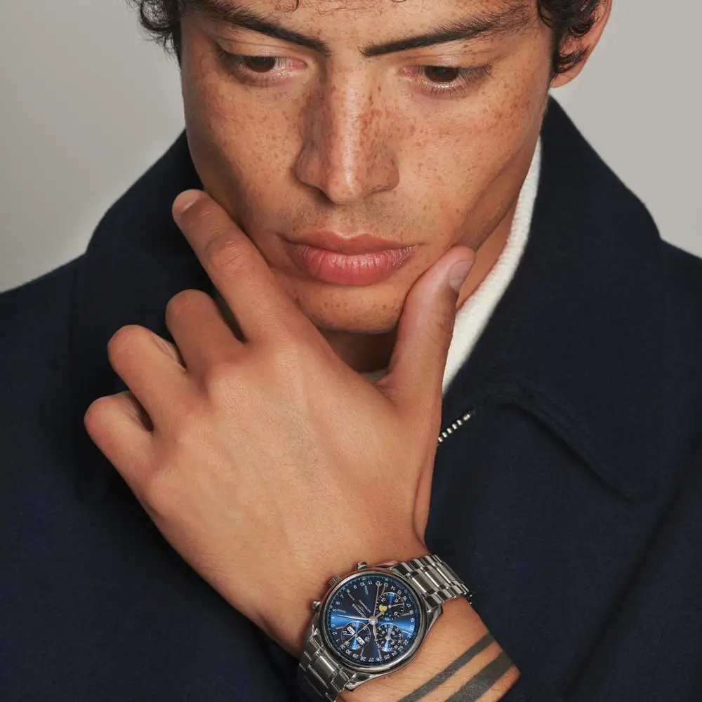 На синем циферблате Sunray выделяются накладные метки, серебристые стрелки и субциферблаты хронографа. В позиции «6 часов» расположено комбинированное окно фазы Луны и даты, а в верхней части отображаются день и месяц, создавая гармоничный баланс.
