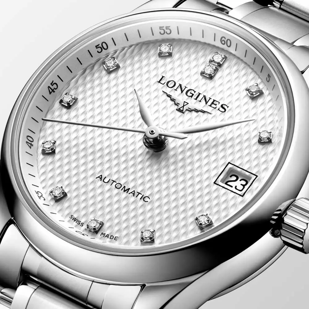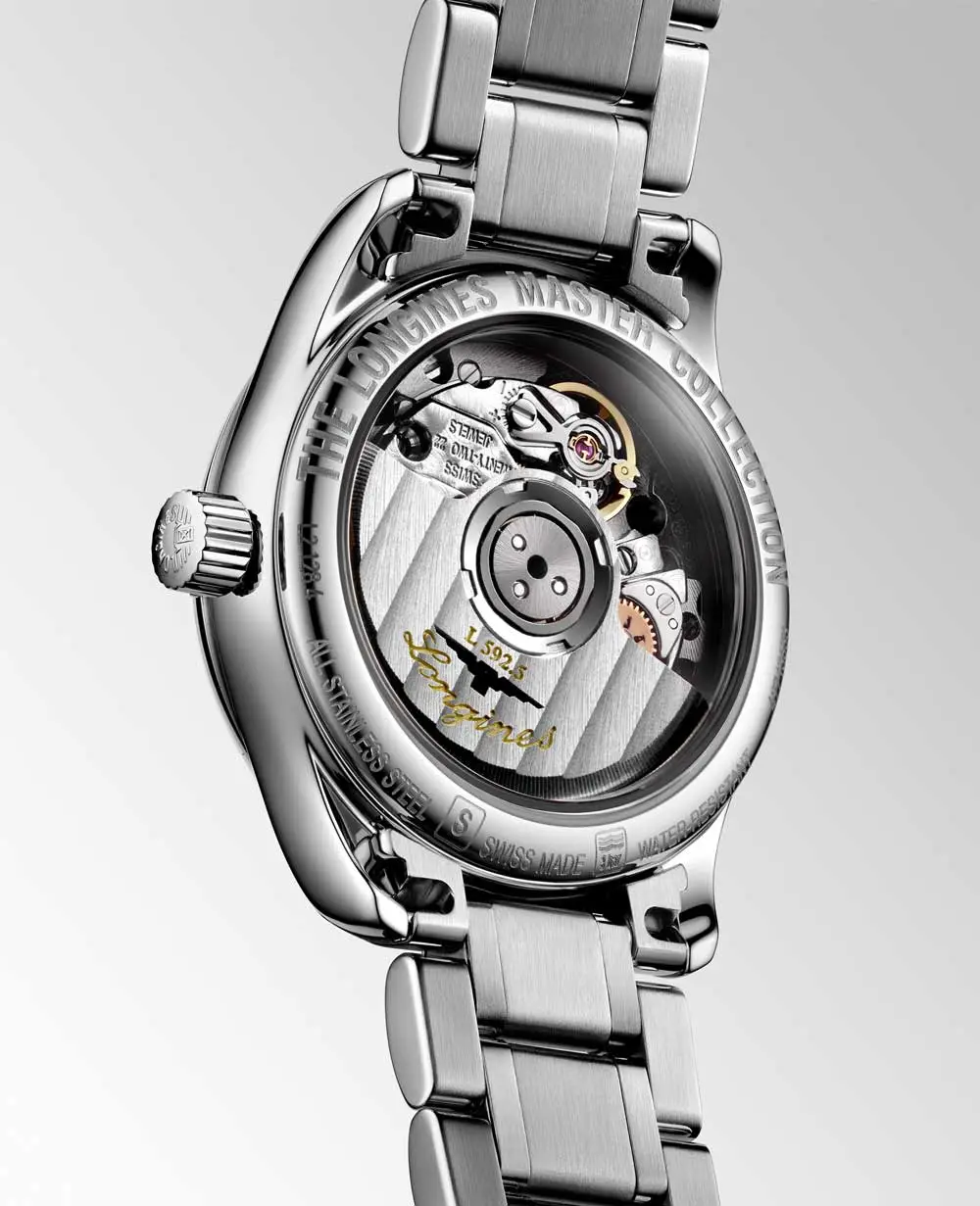 Внутри установлен автоматический калибр L592 с запасом хода до 45 часов, обеспечивающий точность и надёжность. Водонепроницаемость до 30 м (3 ATM) и браслет из нержавеющей стали с тройной застёжкой безопасности подчеркивают роскошный характер женской линии Longines Master Collection.