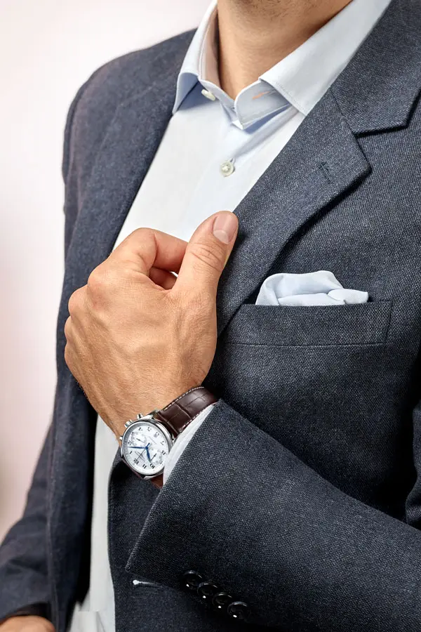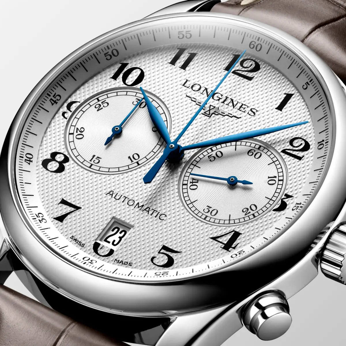 На серебристом циферблате с узором «barleycorn» выделяются синие стрелки, арабские цифры и субциферблаты хронографа. Дата на позиции «6 часов» сохраняет баланс дизайна, а функция хронографа придаёт спортивно-элегантный характер.