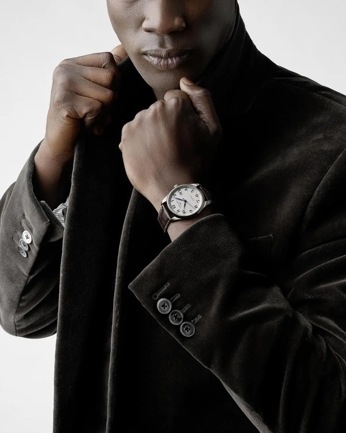 На серебристом циферблате с узором «barleycorn» выделяются чёткие арабские цифры и утончённые воронёные стрелки, создающие гармоничный контраст. Дизайн остаётся сбалансированным, а неброское окно даты на «3 часах» добавляет практичность, не нарушая общей элегантности.