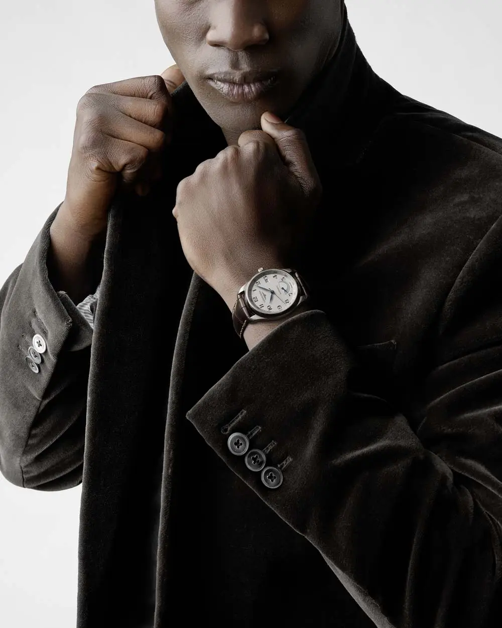 На серебристом гильошированном циферблате с арабскими цифрами выделяются воронёные стрелки и индикатор запаса хода в положении «6 часов». Эта деталь придаёт часам как практичность, так и визуальную гармонию.