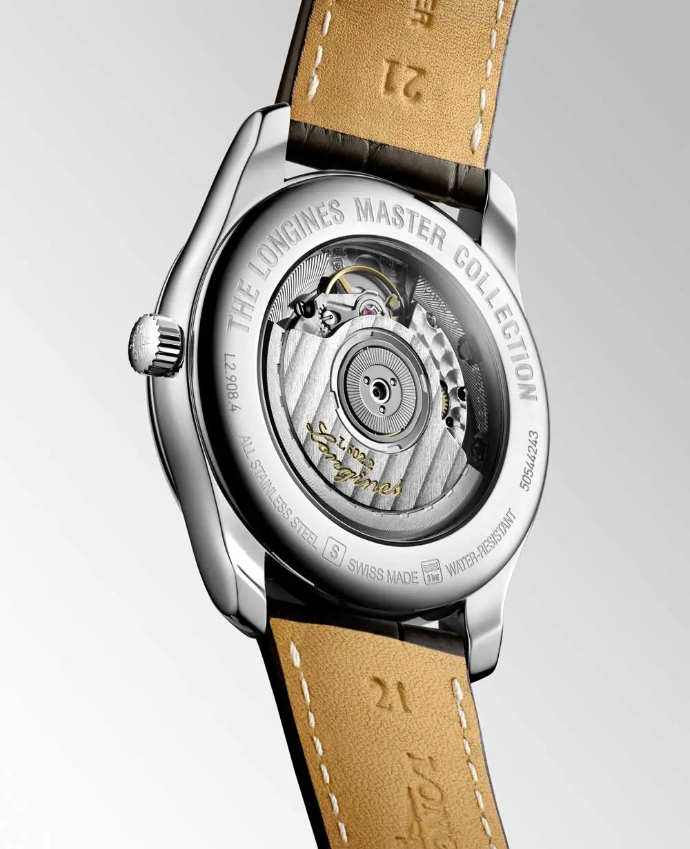 Longines Master Collection L2.908.4.78.3 — элегантная мужская модель, отражающая ценности Longines: традиции, точность и вечная эстетика. Корпус из нержавеющей стали диаметром 40 мм защищён сапфировым стеклом, устойчивым к царапинам, и дополнен ремешком из аллигатора коричневого цвета.