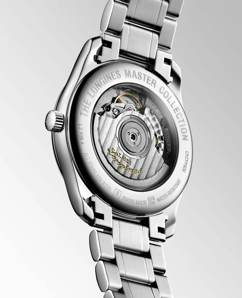 Внутри установлен автоматический калибр L602, обеспечивающий точность и индикацию оставшегося запаса хода. С водонепроницаемостью до 30 м (3 ATM) и стальным браслетом с тройной застёжкой безопасности модель воплощает изысканный характер коллекции Longines Master Collection.