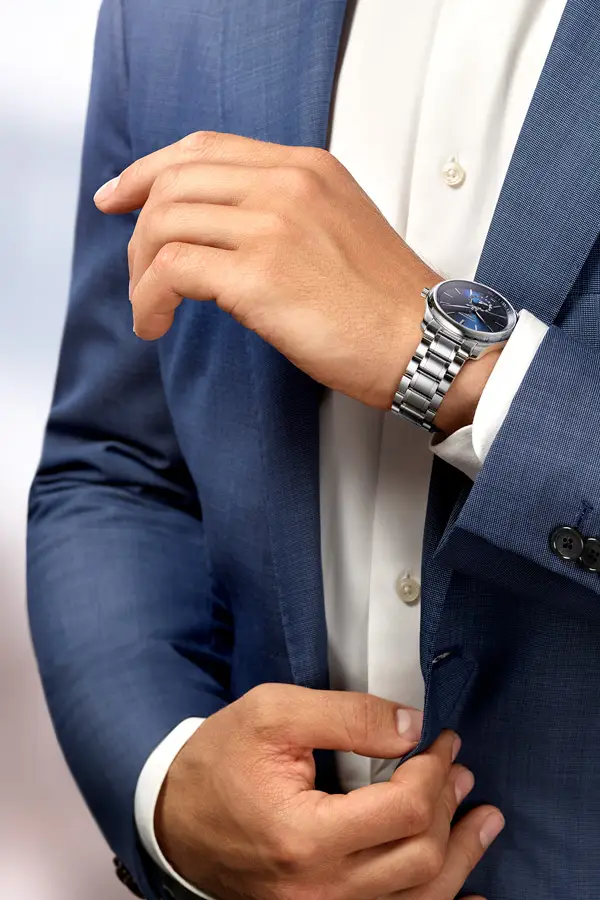 На синем циферблате Sunray выделяются накладные метки и серебристые стрелки. В положении «6 часов» расположен субциферблат, объединяющий индикатор фаз Луны и функцию даты. Эта деталь придаёт часам практичность и изысканный характер.