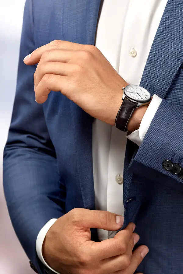 Серебристый циферблат «barleycorn» с арабскими цифрами и воронёными стрелками обеспечивает отличный контраст и читаемость. В положении «3 часа» расположено элегантное окно, совмещающее индикацию месяца и даты.