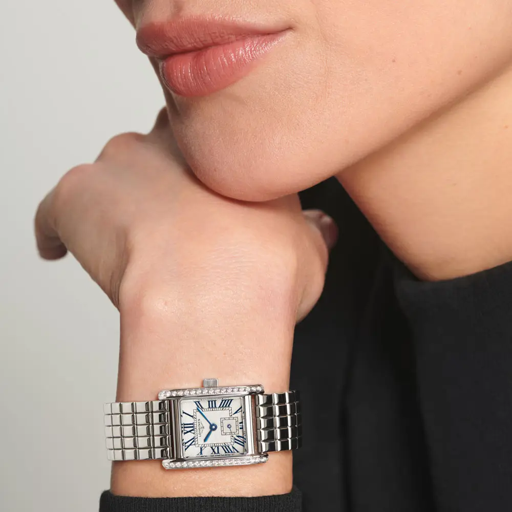 Прямоугольный корпус размером 21,5 × 29 мм изготовлен из нержавеющей стали и украшен бриллиантовым безелем, придающим часам ослепительное сияние. Под сапфировым стеклом расположен серебристый гильошированный циферблат с малой секундной стрелкой на отметке 6 часов. Классические синие стрелки и римские цифры подчеркивают элегантность модели, а коронка с синим синтетическим шпинелем добавляет изысканный женственный штрих.