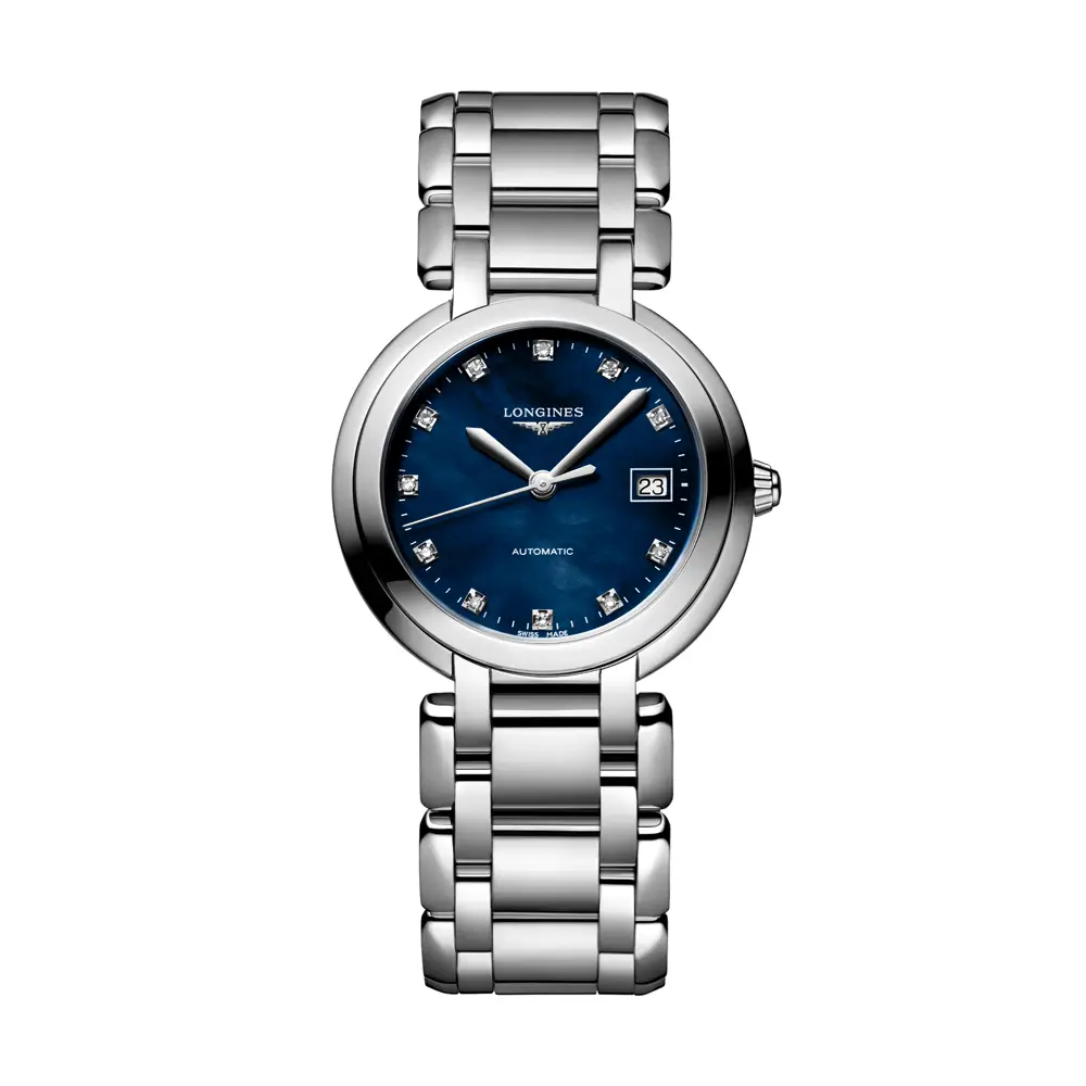 Longines PrimaLuna L8.113.4.98.6 — воплощение женственности, утончённого дизайна и швейцарской точности. Корпус диаметром 30 мм из нержавеющей стали обрамляет циферблат из синего перламутра, украшенный 11 бриллиантовыми метками (0,044 карата). Противоотражающее сапфировое стекло надёжно защищает часы от царапин и обеспечивает превосходную читаемость.
