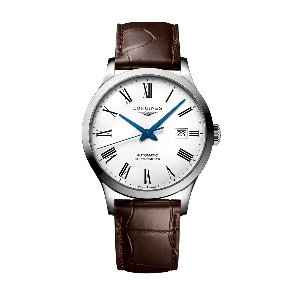 Элегантный ремешок из кожи аллигатора коричневого цвета с раскладывающейся застёжкой дополняет утончённый облик. Longines Record L2.821.4.11.2 — это идеальный выбор для мужчин, ценящих точность, надёжность и безупречный стиль.