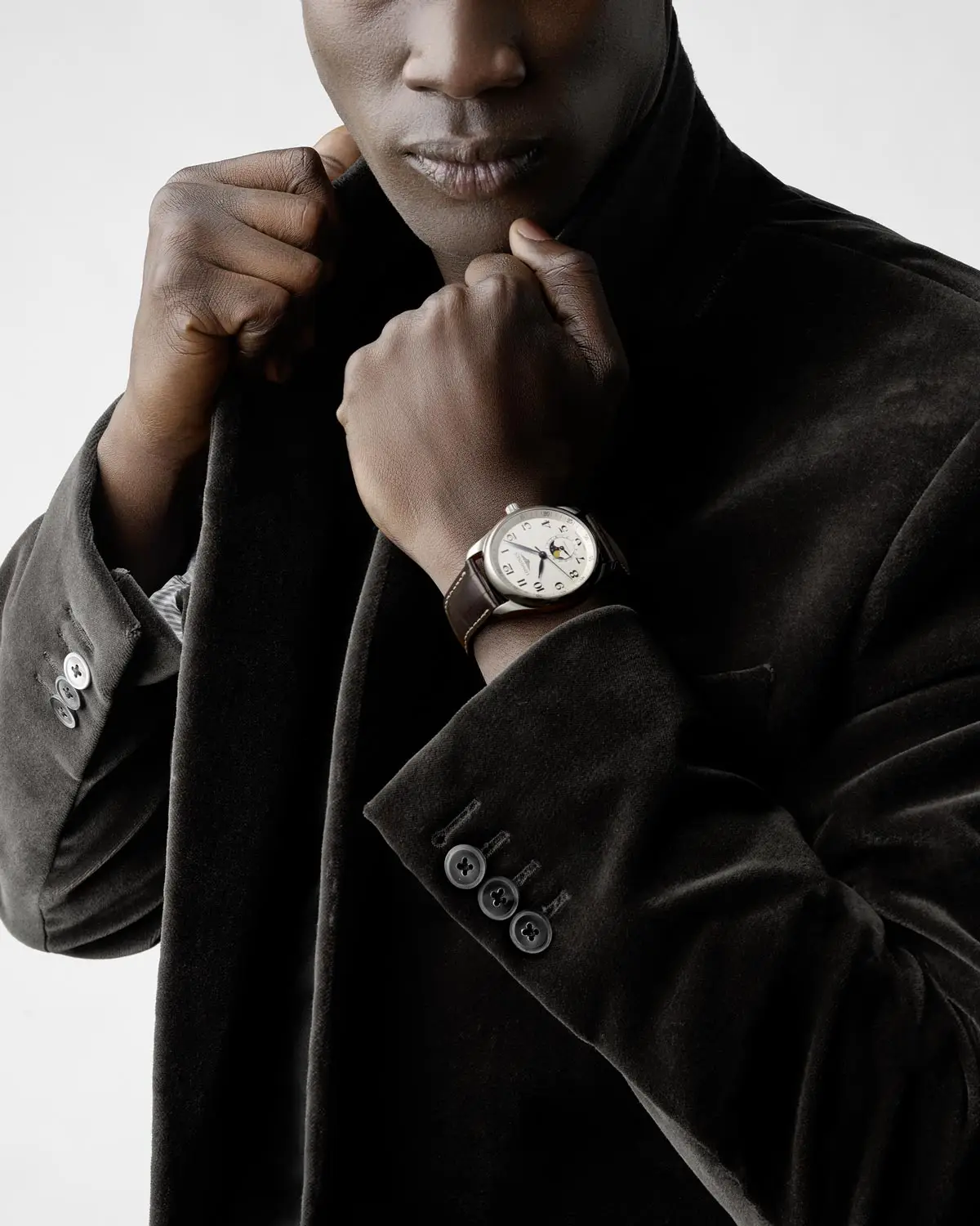 На серебристом циферблате «barleycorn» арабские цифры и воронёные стрелки создают гармоничный контраст. Субциферблат на «6 часах» сочетает индикацию фаз Луны и функцию даты, добавляя функциональности и визуальной глубины.