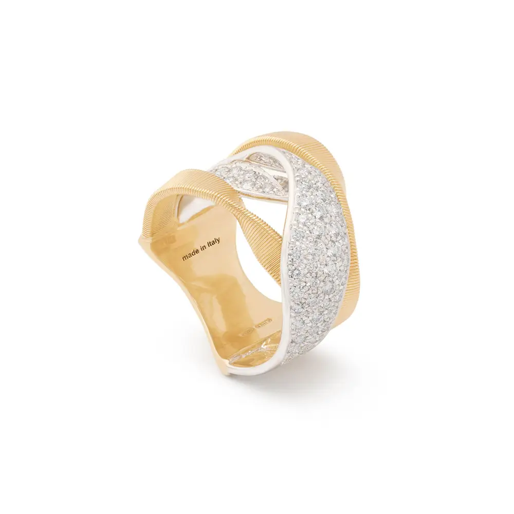 Marco Bicego Marrakech AG333-B1 YW M5 — это роскошное женское кольцо из легендарной коллекции Marrakech, известной своей уникальной техникой ручного изготовления. Модель выполнена из золота 18 кт жёлтого и белого цвета, а её изысканные спиралевидные линии создаются вручную, вдохновлённые плавными формами песчаных дюн.