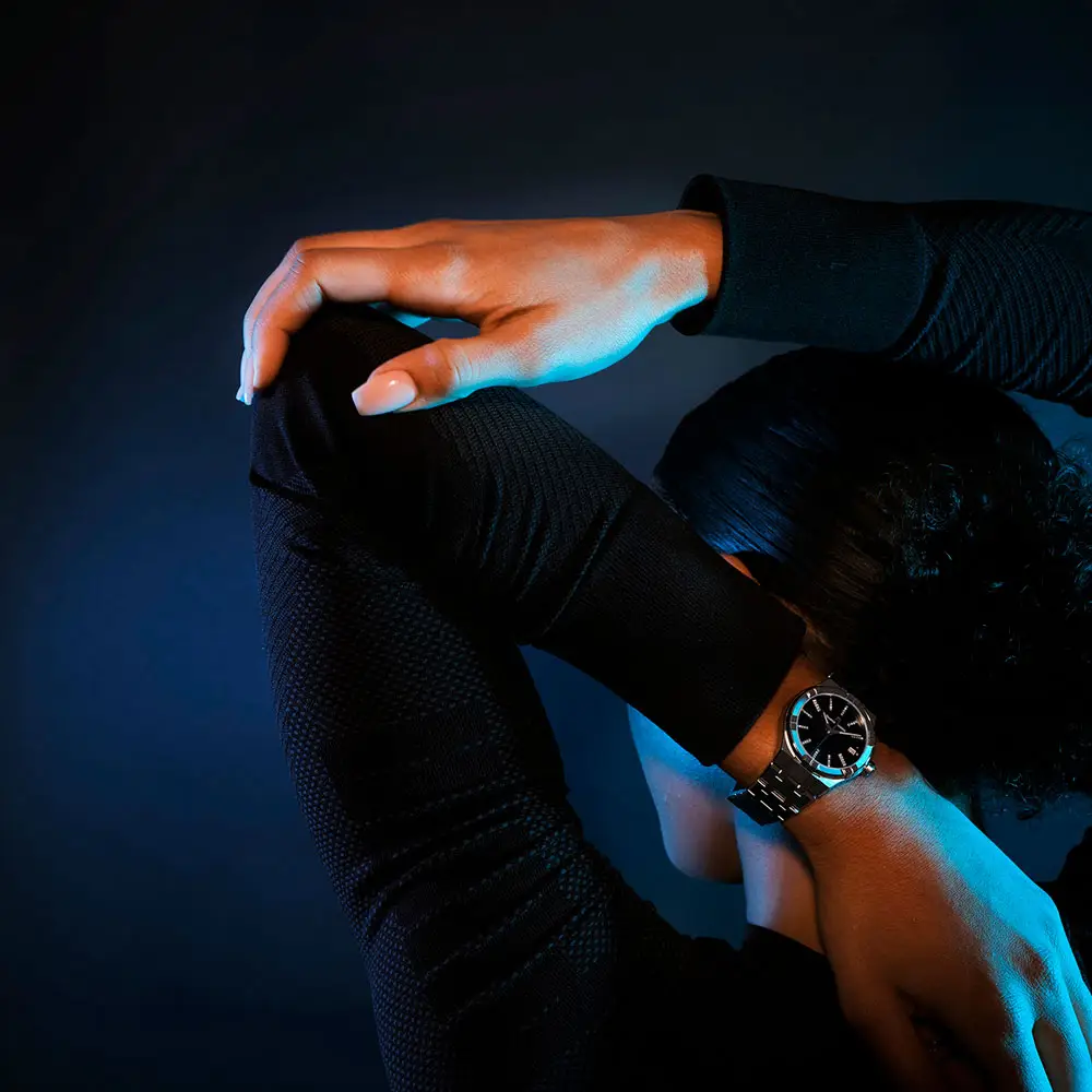 Корпус из нержавеющей стали диаметром 35 мм выглядит изящно и сбалансировано. Черный циферблат, украшенный 56 бриллиантами, придает блеск и элегантность, а окно даты на 3 часах добавляет функциональности. Сапфировое стекло с антибликовым покрытием обеспечивает отличную читаемость и защиту от царапин.