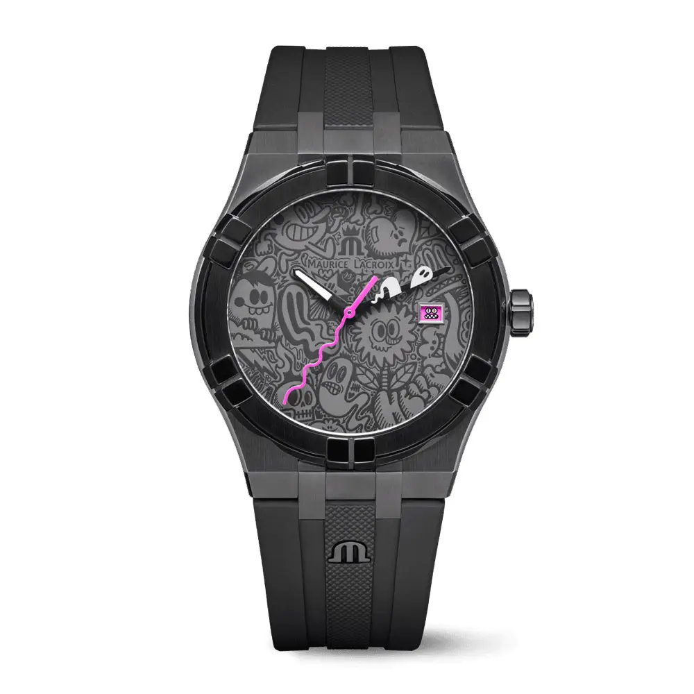 Maurice Lacroix AIKON Quartz WOTTO Limited Edition (AI1108-PVL20-090-2) — эксклюзивная модель, выпущенная ограниченной серией в 500 экземпляров. Она сочетает точность швейцарского кварцевого калибра с дерзким стрит-арт дизайном WOTTO. Корпус из нержавеющей стали диаметром 40 мм оснащён сапфировым стеклом и завинчивающейся заводной головкой.