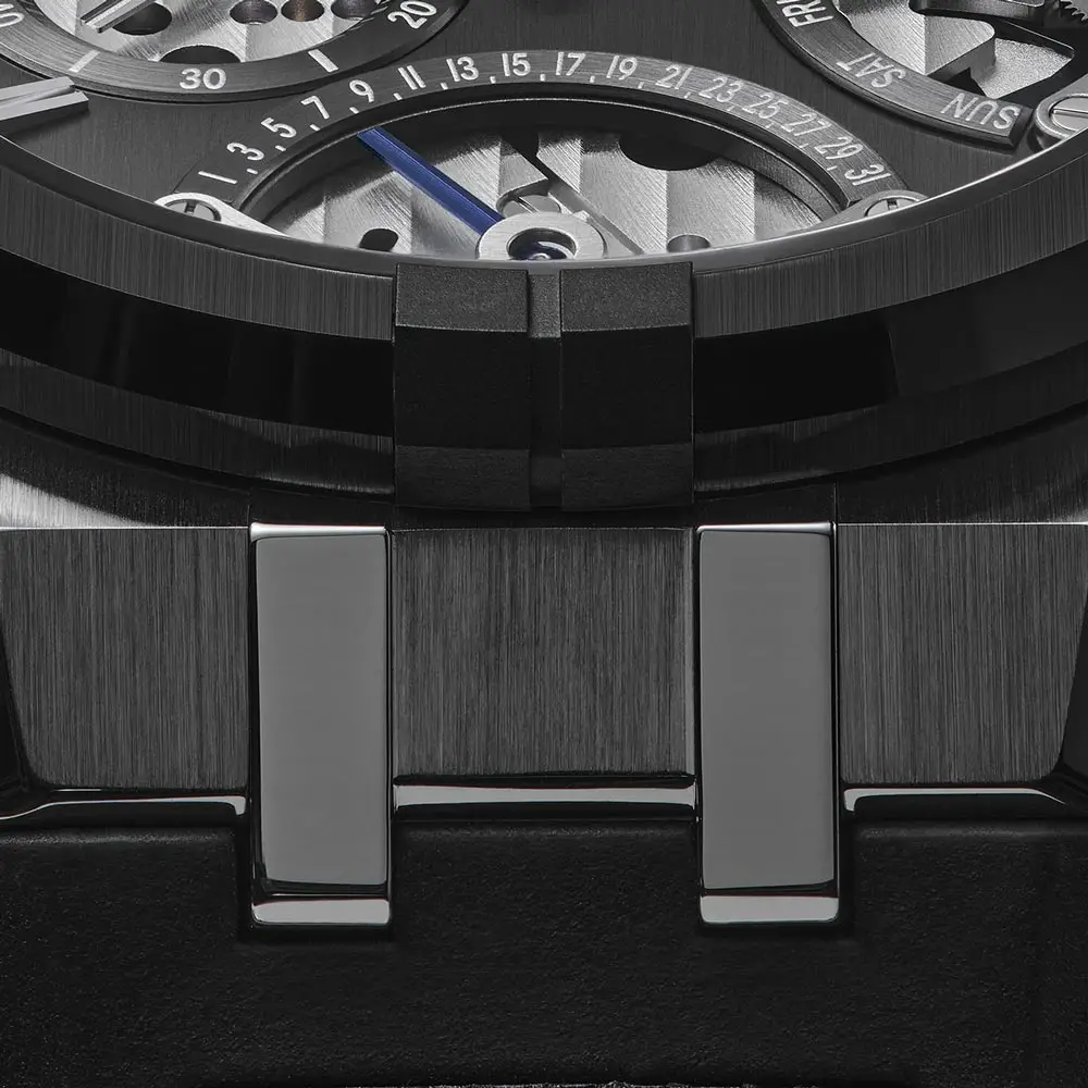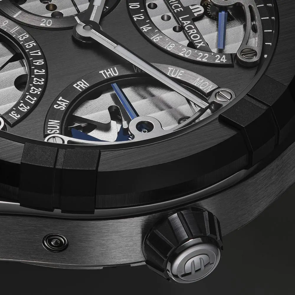 Антрацитовый циферблат с ретроградной индикацией предлагает необычное отображение функций. Тройная ретроградная функция (дата, день недели и другие индикаторы) делает модель уникальной. Люминесцентные стрелки и метки обеспечивают читаемость, а открытая архитектура добавляет глубину.