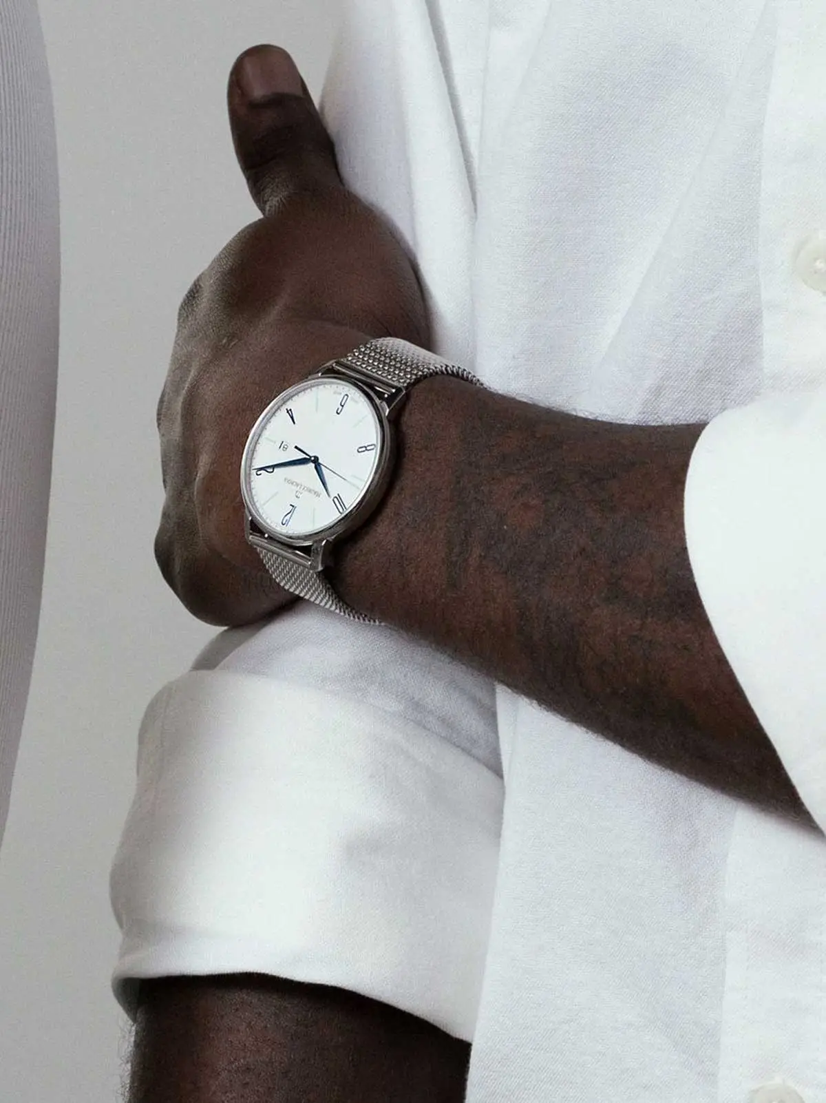 Белый циферблат с солнечным узором украшен серебристыми стрелками и метками, а окно даты на 3 часах добавляет практичности. Сапфировое стекло с антибликовым покрытием защищает циферблат и придаёт часам утончённый блеск.