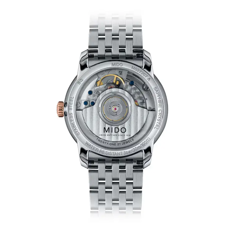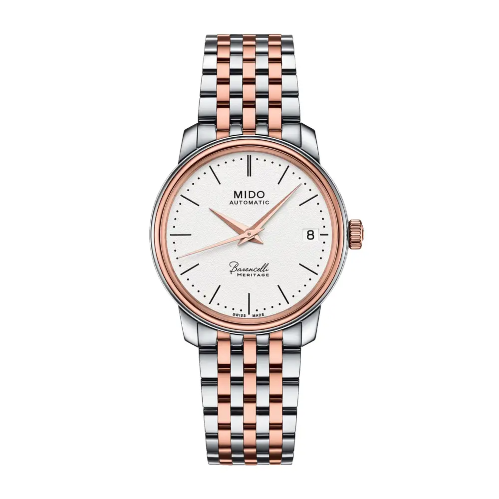 Часы Mido Baroncelli Heritage Lady — это элегантная и вневременная женская модель, сочетающая швейцарскую точность и изящную эстетику. Круглый корпус диаметром 33 мм выполнен из высококачественной нержавеющей стали, дополненной деталями с розовым напылением, включая безель, придающими часам утончённый и современный вид.