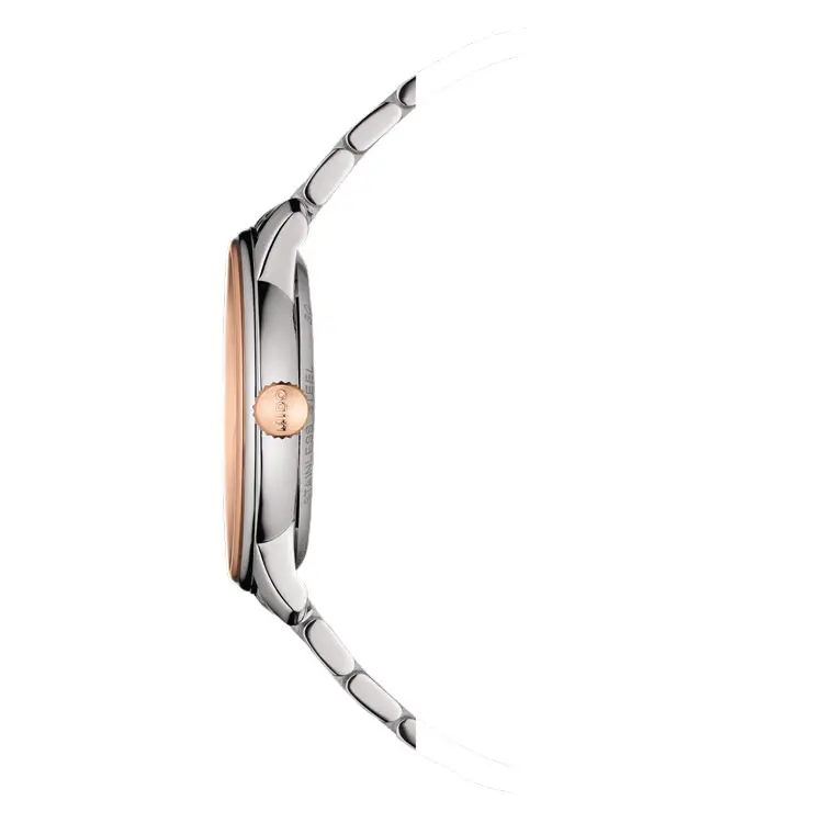 Элегантный двухцветный браслет из нержавеющей стали с розовым напылением и удобной раскладывающейся застёжкой подчеркивает роскошный характер часов и обеспечивает комфорт при ношении. Благодаря водонепроницаемости 3 ATM (30 метров) часы подходят для ежедневного использования в обычных условиях.