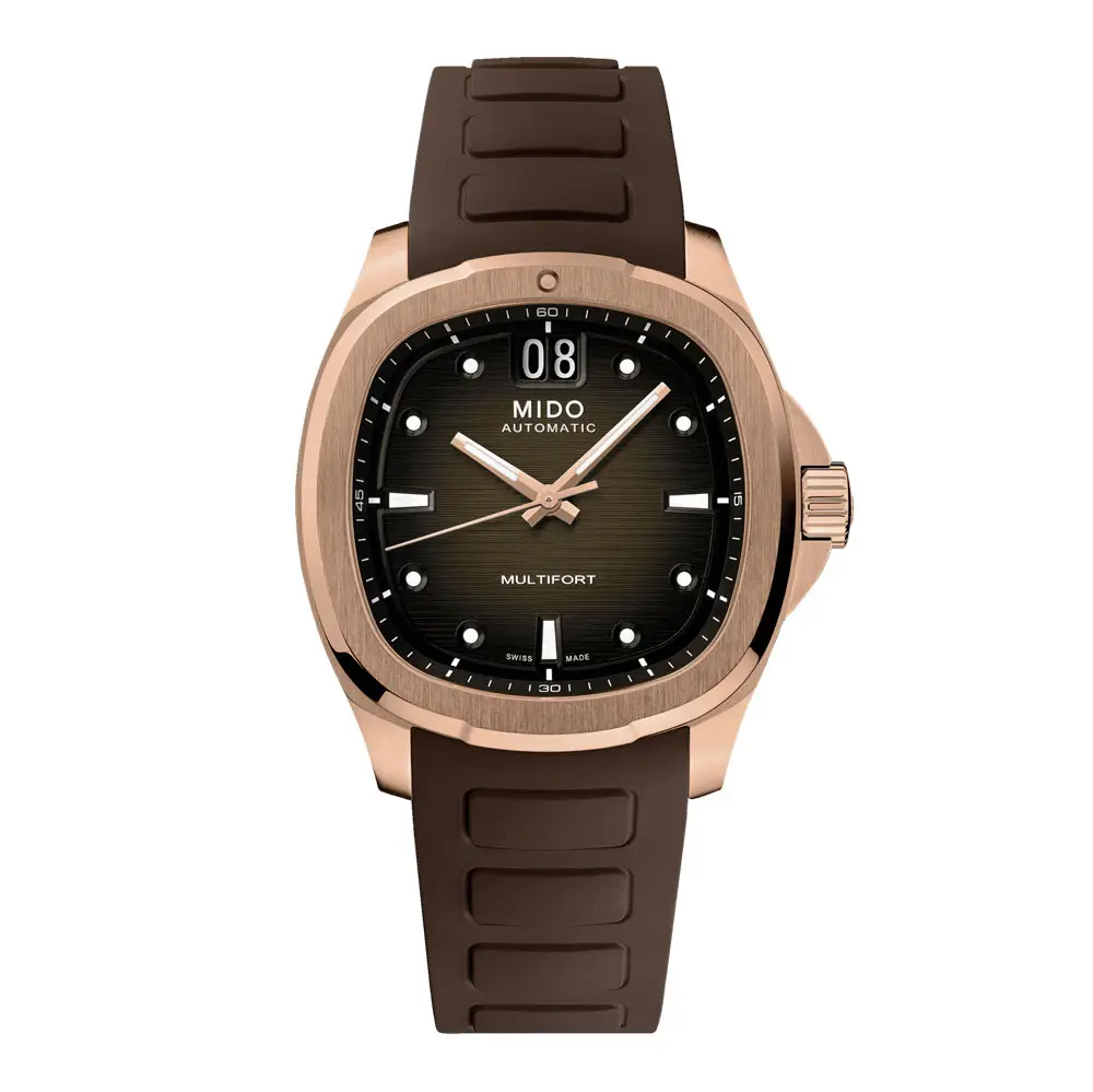Mido Multifort TV Big Date M049.526.37.291.00 продолжает ретро-эстетику семидесятых годов с современным уклоном. Часы впечатляют квадратным корпусом в форме телевизионного экрана размером примерно 40 × 39 мм, выполненным из нержавеющей стали с PVD-покрытием оттенка розового золота. Стильный коричневый циферблат с вертикальным брашированием и тональным градиентом (эффект fumé) придает часам уникальный визуальный характер.