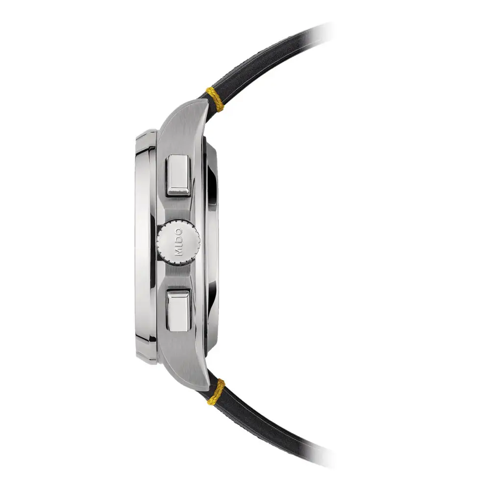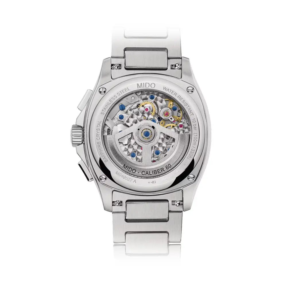 Внутри находится автоматический механизм Caliber 60 с инновационной пружиной Nivachron™, которая повышает устойчивость к воздействию магнитов и обеспечивает долговременную точность хода. Эти часы обладают запасом хода до 60 часов и оснащены функциями хронографа, малой секундной стрелки и индикатора даты. Четкое расположение циферблата и точное исполнение отражают швейцарские традиции часового дела Mido.