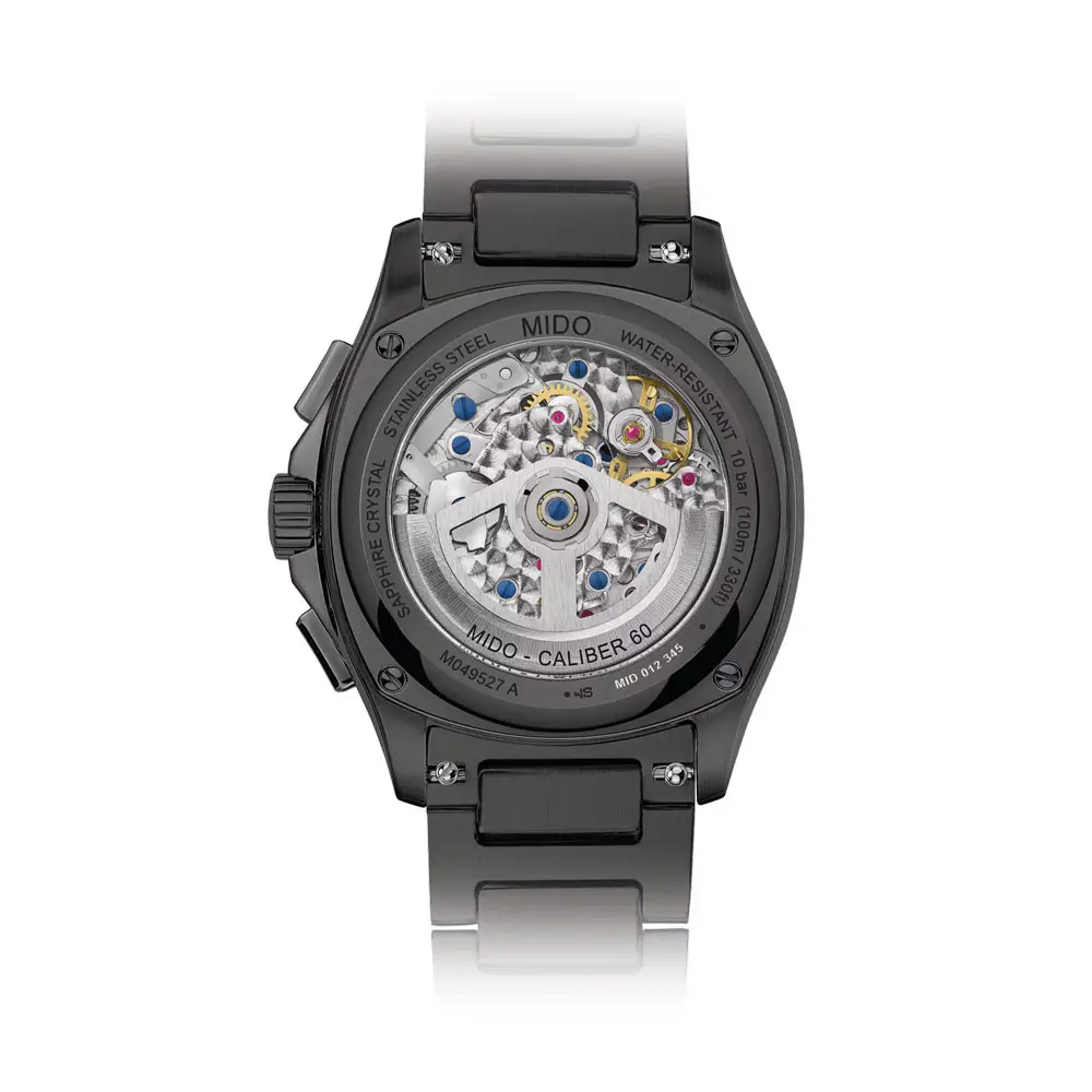 Внутри часов установлен автоматический калибр 60 с запасом хода до 60 часов и инновационной пружиной Nivachron™, устойчивой к намагничиванию. Хронограф обеспечивает точное времяисчисление благодаря функции секундомера, а также индикации даты и малой секунды. Сбалансированное расположение дополнительных циферблатов и точная работа подчеркивают швейцарские часовые качества марки Mido.