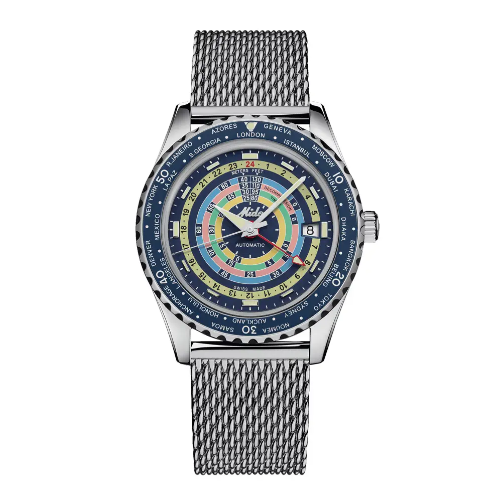 Часы Mido Ocean Star Decompression Worldtimer впечатляют своим смелым дизайном и функциональностью, которая особенно понравится путешественникам и дайверам. Круглый корпус диаметром 40,5 мм выполнен из высококачественной нержавеющей стали и защищён прочным сапфировым стеклом, обеспечивающим отличную защиту и читаемость.