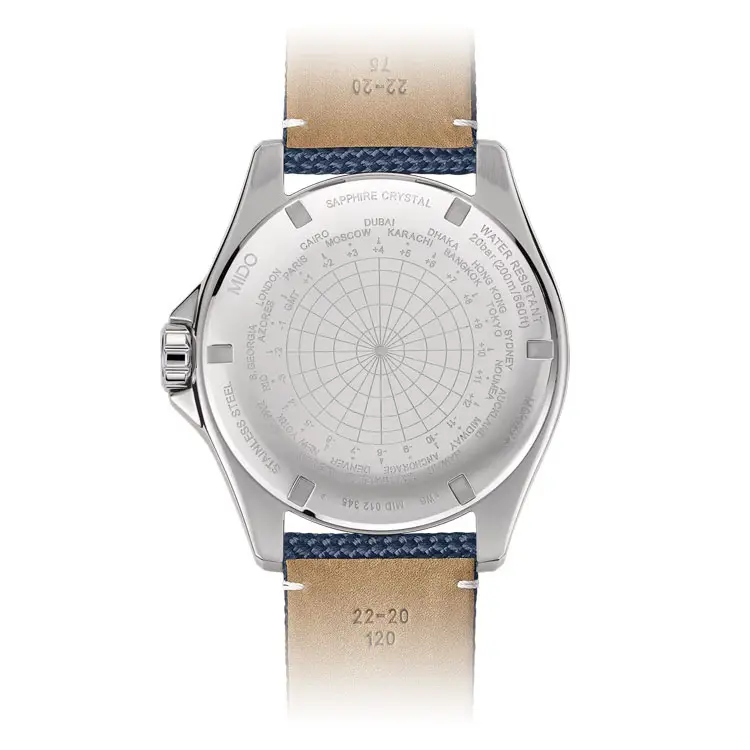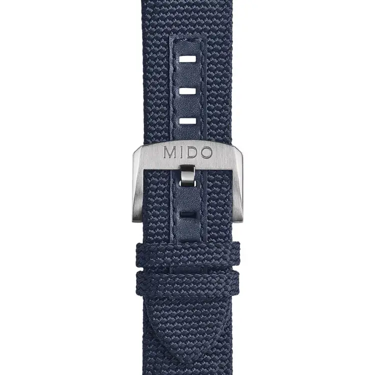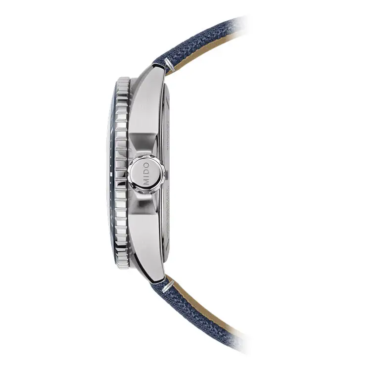 Чистый и прочный дизайн виден и в деталях — синий текстильный ремешок с классической пряжкой обеспечивает комфортное и безопасное ношение. Благодаря водонепроницаемости 20 ATM (200 метров) часы подходят не только для ежедневного ношения, но и для плавания и сноркелинга.