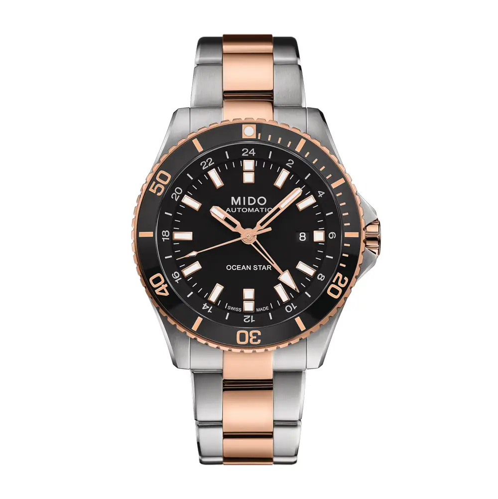 Mido Ocean Star GMT M026.629.22.051.00 сочетает спортивную элегантность, функциональность GMT и швейцарскую точность. Корпус из нержавеющей стали с розовым PVD-покрытием делает модель стильной и практичной.