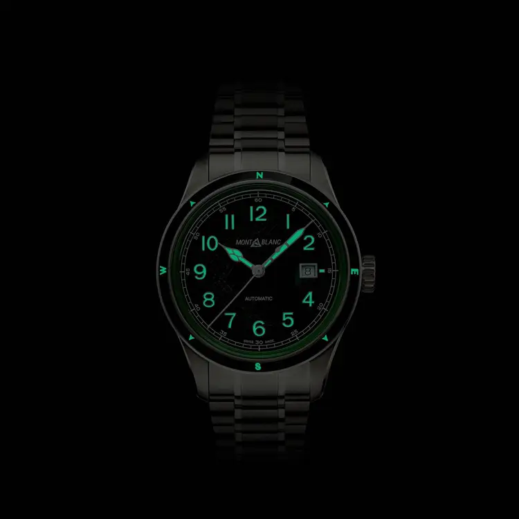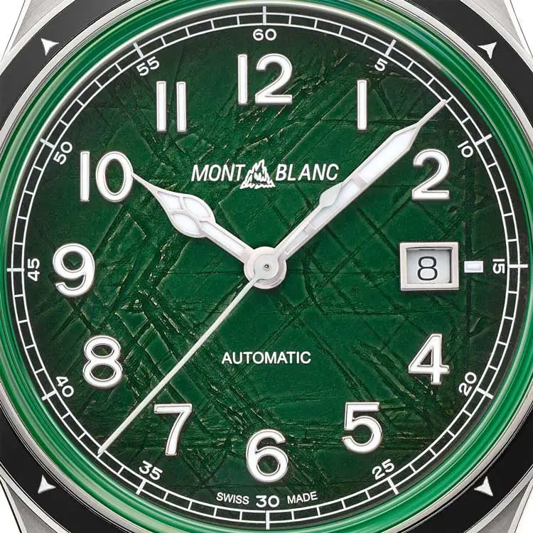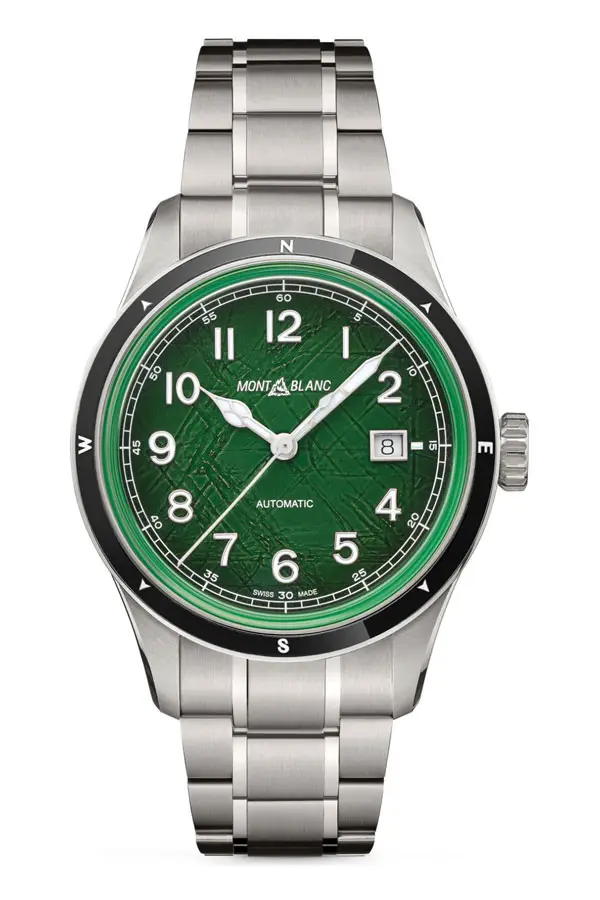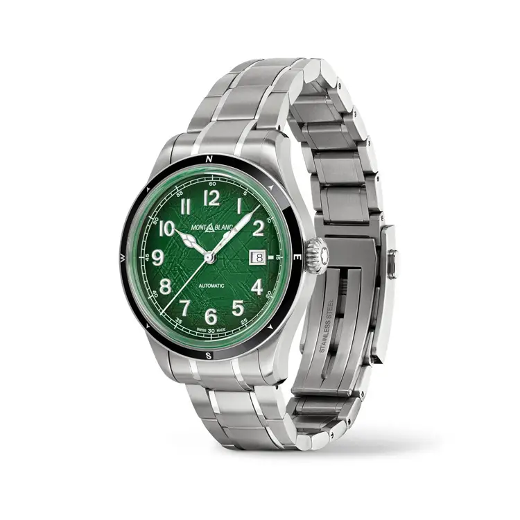 Montblanc 1858 Automatic Date 0 Oxygen 133269 сочетает техническую точность с духом приключений. Круглый корпус из нержавеющей стали диаметром 41 мм дополнен прочной керамической безелью и сапфировым стеклом, обеспечивающим отличную читаемость даже в сложных условиях. Выразительный зелёный циферблат навеян природными пейзажами и дополнен датой на позиции 3 часов.