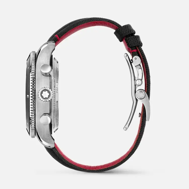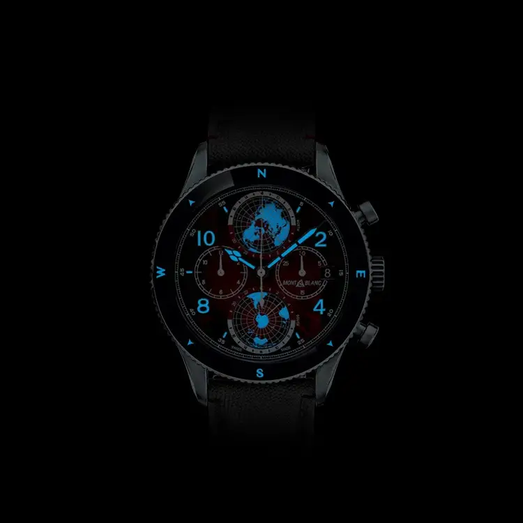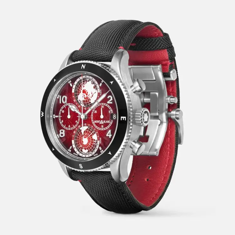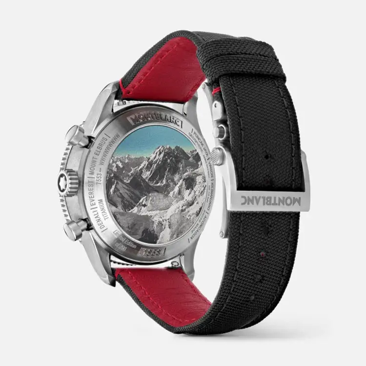 Корпус диаметром 44 мм выполнен из лёгкого и прочного титана, оснащён двунаправленным керамическим безелем с отметками компаса. Красный циферблат с текстурой «растрескавшегося льда» напоминает о замёрзших вершинах Альп. Под сапфировым стеклом вращаются две полусферы, отображающие мировое время, а функция хронографа подчёркивает спортивный характер часов.