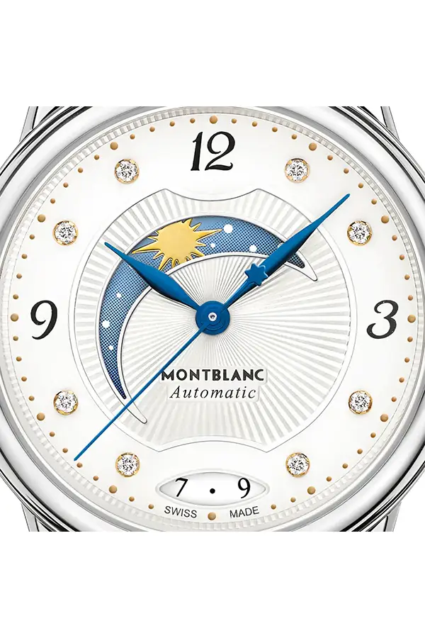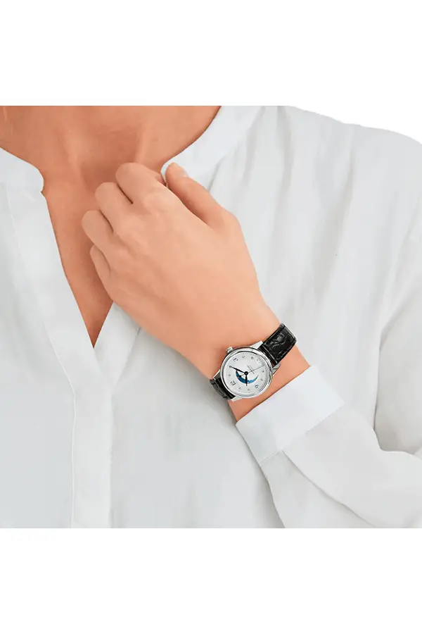 Женские часы Bohéme Day & Night 114730 от Montblanc - прекрасный пример часового мастерства мастера, ведь они способны отображать фазы Луны. Восемь крупных бриллиантов, обозначающих часы, придают циферблату необычное оживление. Кроме того, вы получаете информацию о текущей дате. 30-миллиметровый корпус выполнен из стали, а ремешок - из кожи с отделкой под крокодила.