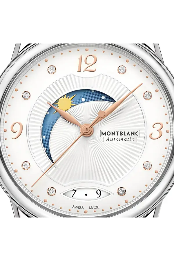 Оцените красоту женских часов Boheme Day & Night 119935 от Montblanc. С первого взгляда в глаза бросается не только визуально привлекательная функция отображения фаз Луны, но и восемь ослепительных бриллиантов, заменивших цифры на циферблате часов. На циферблате, помимо прочего, также отображается дата. Часы водонепроницаемы до 30 м.