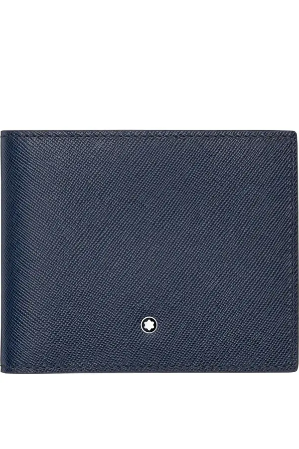 Мужское портмоне Sartorial от Montblanc выполнено из тонкой телячьей кожи. Необычный темно-синий цвет привлекает внимание с первого взгляда. Передняя часть кошелька украшена эмблемой бренда, которая также находится на жаккардовой подкладке. Внутри 6 карманов для карт, 2 кармана для купюр и еще 2 кармана. Карман для монет отсутствует.