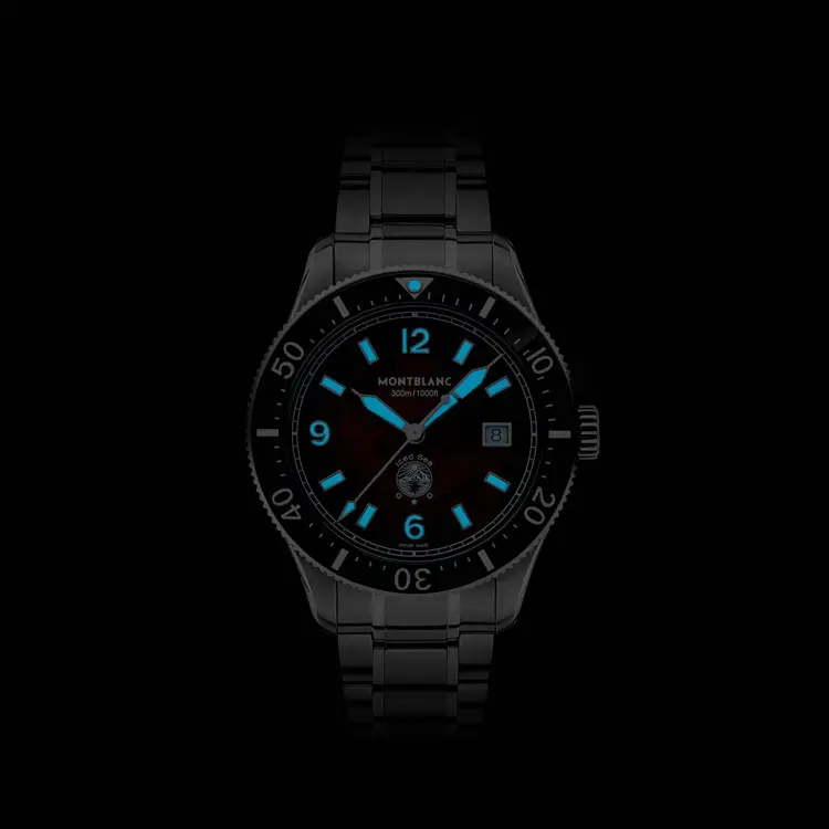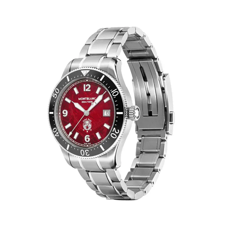 Montblanc Iced Sea Automatic Date 132291 сочетает в себе спортивную элегантность и выразительный характер. Круглый корпус из нержавеющей стали диаметром 41 мм дополнен яркой керамической безелью и бордовым аналоговым циферблатом с текстурой, напоминающей глубины замерзшего озера — характерный элемент этой коллекции. Циферблат оснащен удобной датой на 3 часах и защищен сапфировым стеклом с устойчивостью к царапинам.