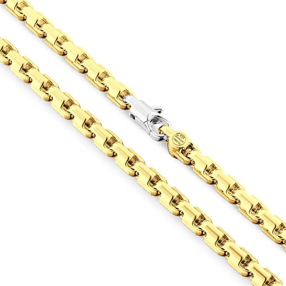 Это роскошное мужское ожерелье Zancan изготовлено из тщательно полированных звеньев из 18-каратного жёлтого золота, образующих выразительную геометрическую структуру, символизирующую силу, уверенность и изысканную эстетику итальянского дизайна. Особое внимание привлекает прочный карабин из 18-каратного белого золота, который создаёт элегантный контраст с тёплым оттенком жёлтого золота и подчёркивает двухцветный характер изделия.