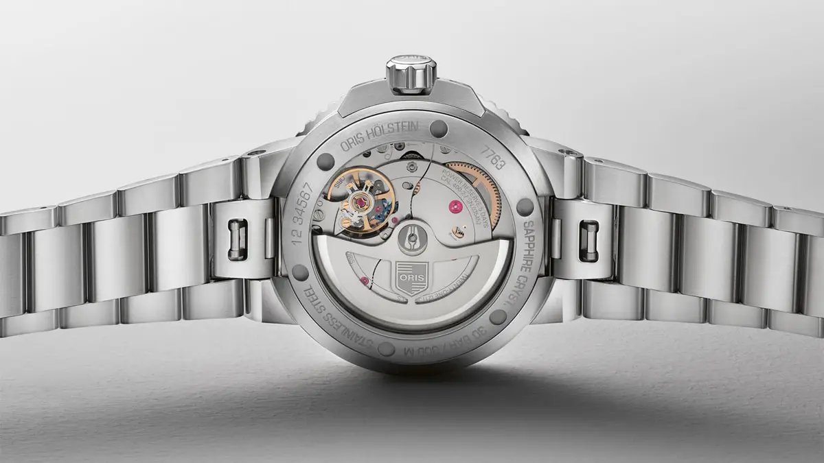 В основе часов — мануфактурный калибр Oris 400, обеспечивающий запас хода 120 часов (5 дней), выдающуюся устойчивость к магнитным полям и увеличенные интервалы обслуживания. Окошко даты на 6 часах придаёт практичность, а прозрачная задняя крышка открывает вид на тонкую отделку швейцарского механизма.