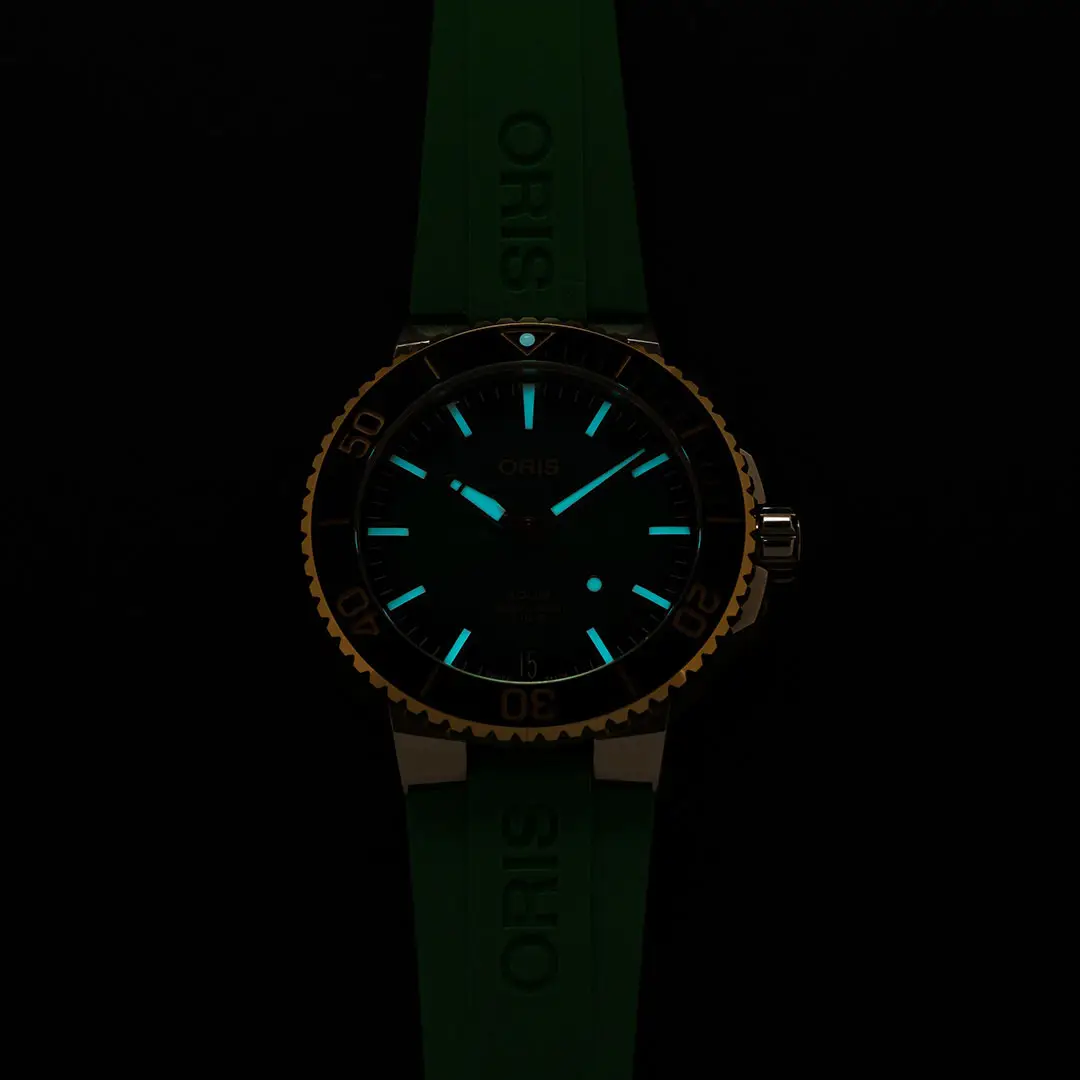 Oris Aquis - флагманская дайверская коллекция бренда, сочетающая в себе функциональность, прочность конструкции и современный дизайн. Часы коллекции Aquis, предназначенные для использования под водой, обладают водонепроницаемостью до 300 метров, завинчивающейся заводной головкой, однонаправленным люнетом и высокой устойчивостью к ударам и давлению.