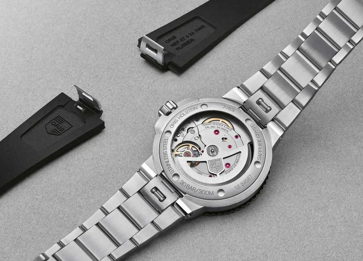 Внутри установлен мануфактурный калибр Oris 400 с запасом хода 120 часов (5 дней), повышенной устойчивостью к магнитным полям и увеличенными интервалами обслуживания. Окно даты на позиции 6 часов создаёт визуальное равновесие, а прозрачная задняя крышка демонстрирует изысканную отделку механизма.