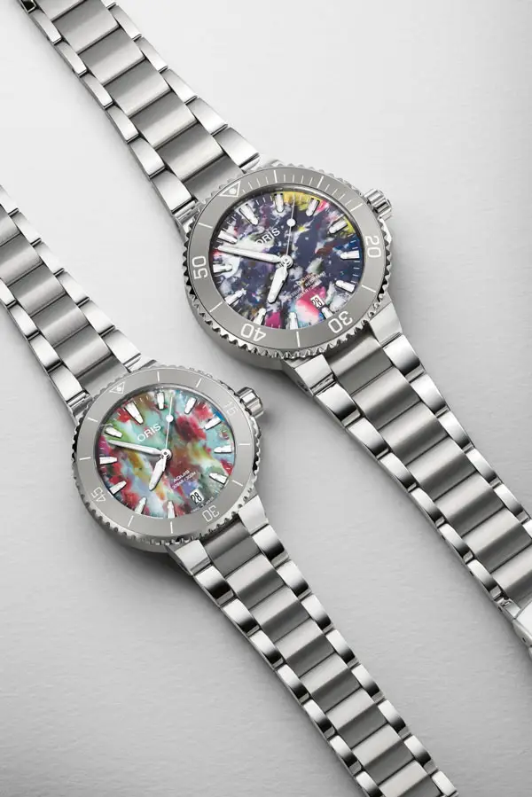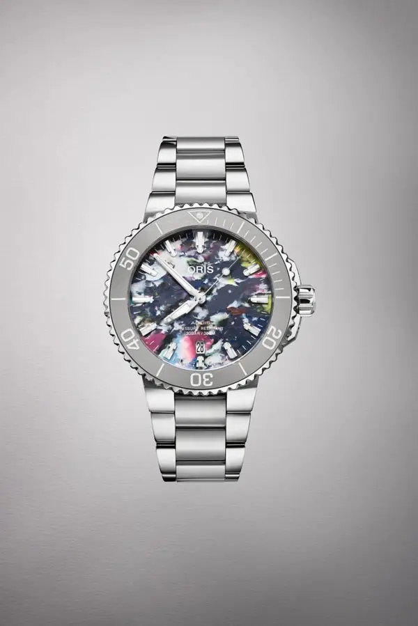 Главная особенность модели — циферблат из переработанного пластика PET, делающий каждое изделие уникальным: двух одинаковых экземпляров не существует. Этот элемент символизирует экологическую миссию Oris и стремление защищать океаны. Внутри установлен автоматический калибр Oris 733 с запасом хода около 41 часа, видимый через прозрачную заднюю крышку.