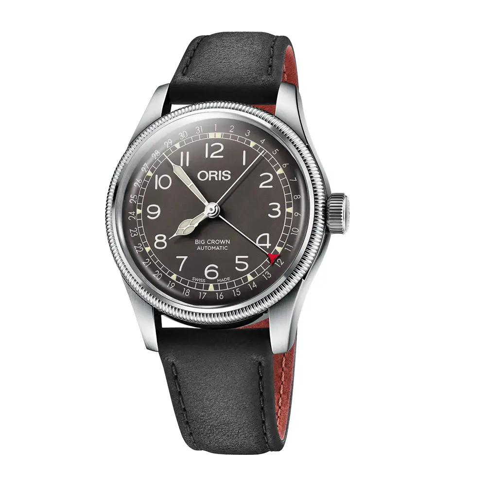С водонепроницаемостью до 50 м (5 бар) и чёрным кожаным ремешком с классической пряжкой Oris Big Crown Pointer Date воплощает дух традиционных авиационных часов — надёжных, изысканных и вне времени, идеально подходящих как для повседневной носки, так и для торжественных случаев.