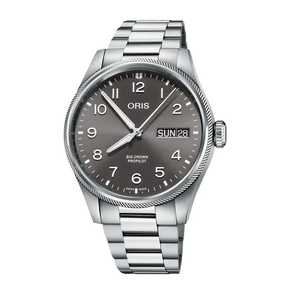 Oris Big Crown ProPilot Big Day Date 01 752 7760 4063-07 8 22 08P — современная интерпретация классических пилотских часов Oris, сочетающая техническую точность, функциональный дизайн и швейцарскую надёжность. Корпус из нержавеющей стали диаметром 45 мм дополнен серым текстурированным циферблатом с люминесцентными стрелками и арабскими цифрами, обеспечивающими отличную читаемость при любом освещении. Сапфировое стекло с антибликовым покрытием гарантирует кристальную ясность с любого угла.