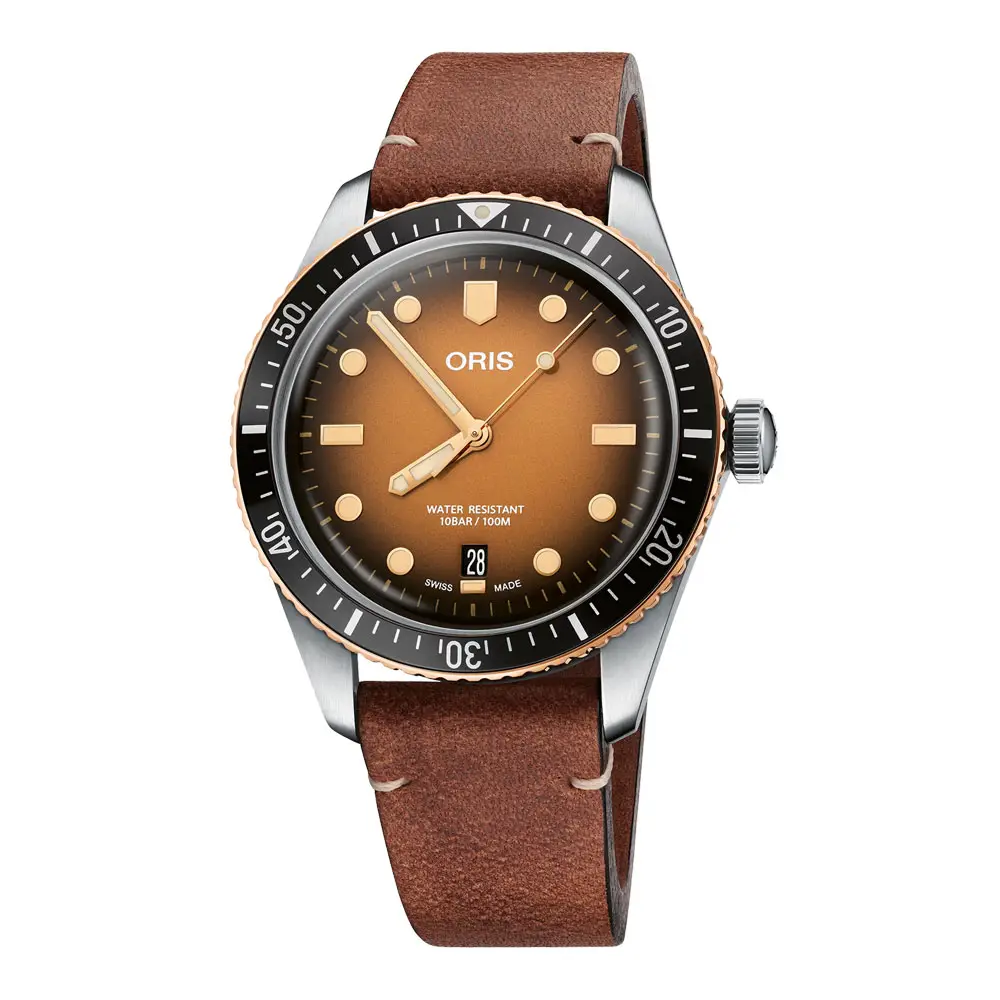 Модель Oris Divers Sixty-Five Date 01 733 7707 4356-07 5 20 45 от Oris сочетает винтажный дайверский стиль и современные швейцарские технологии. Корпус из нержавеющей стали 40 мм дополнен односторонним вращающимся безелем из бронзы, который со временем покрывается уникальной патиной. Элегантный коричневый градиентный циферблат с Super-LumiNova® обеспечивает отличную читаемость и защищён выпуклым сапфировым стеклом с антибликовым покрытием.
