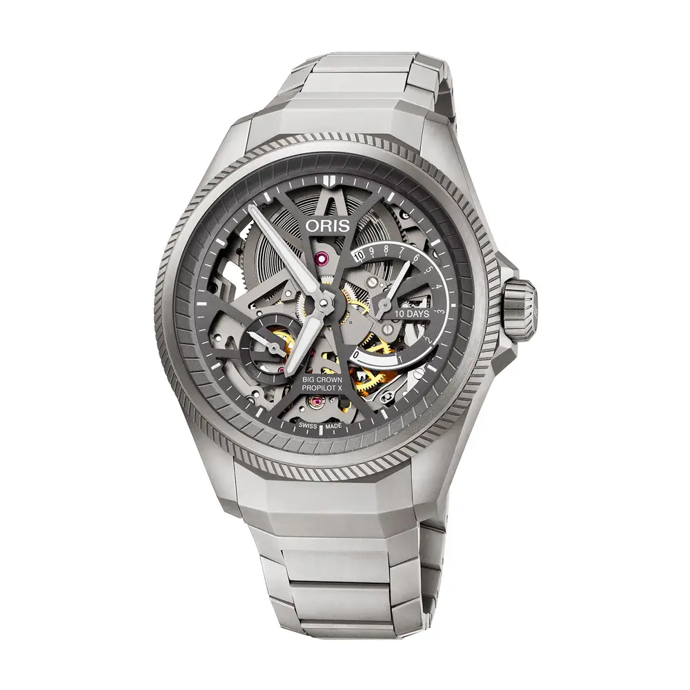 Oris ProPilot X - это авангардное переосмысление авиационной серии ProPilot, переносящее традиционные часы пилота в мир современного дизайна и передовых часовых технологий. Коллекция отличается чистыми индустриальными линиями, матовым титановым корпусом и интегрированным титановым браслетом, что придает ей легкость, прочность и технический характер.