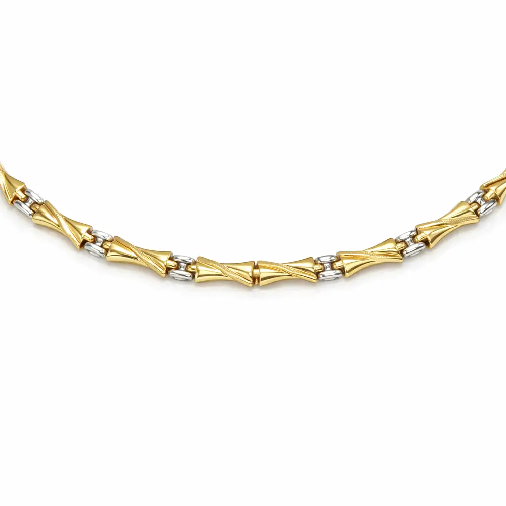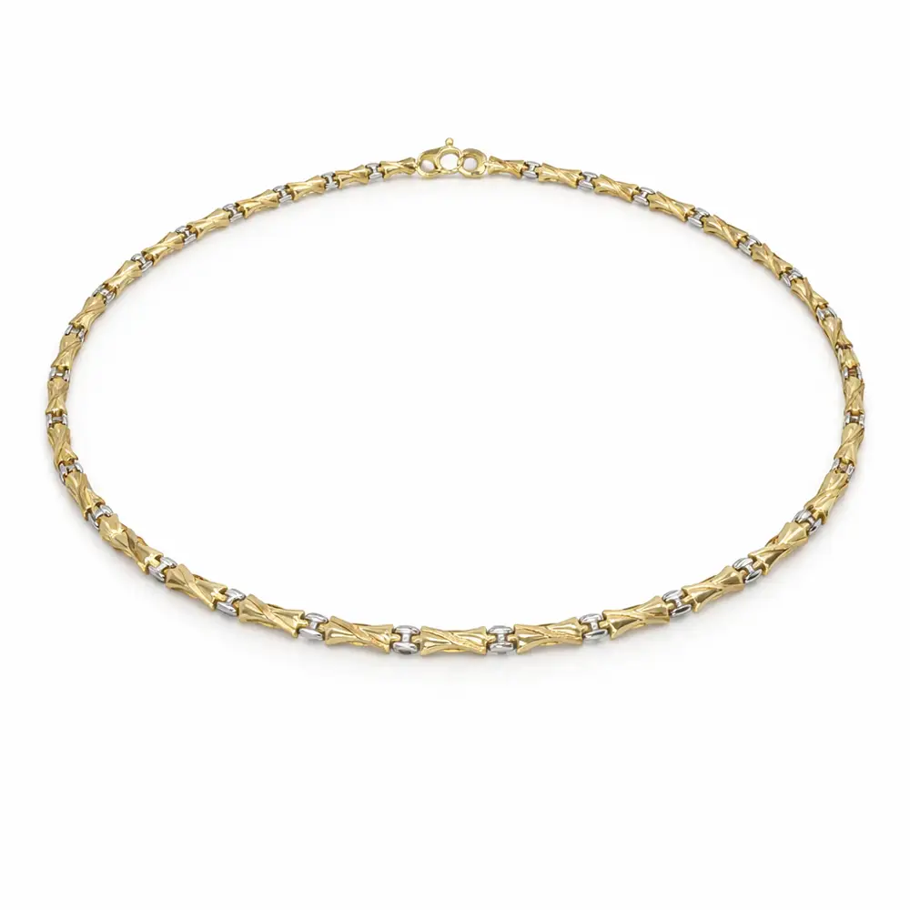 Этот элегантный ожерелье из комбинированного золота привлекает внимание своим чистым и неподвластным времени дизайном, выполненным из аккуратно сформированных звеньев из жёлтого и белого золота. Гармоничное сочетание двух оттенков придаёт украшению современный и утончённый характер. Точная обработка обеспечивает плавность линий и мягкий блеск.