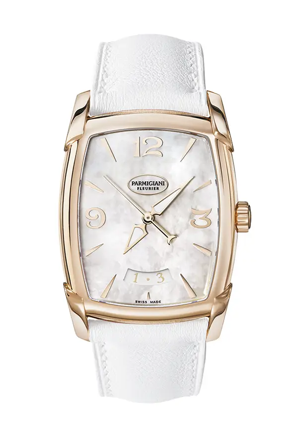 Элегантный бочкообразный корпус размером 37,5 × 31,2 мм выполнен из благородного 18-каратного розового золота, придающего часам теплый и благородный вид. Чистая эстетика подчёркнута изящным безелем из розового золота, который элегантно обрамляет перламутровый аналоговый циферблат, играющий нежными переливами и подчёркивающий женственный характер модели.