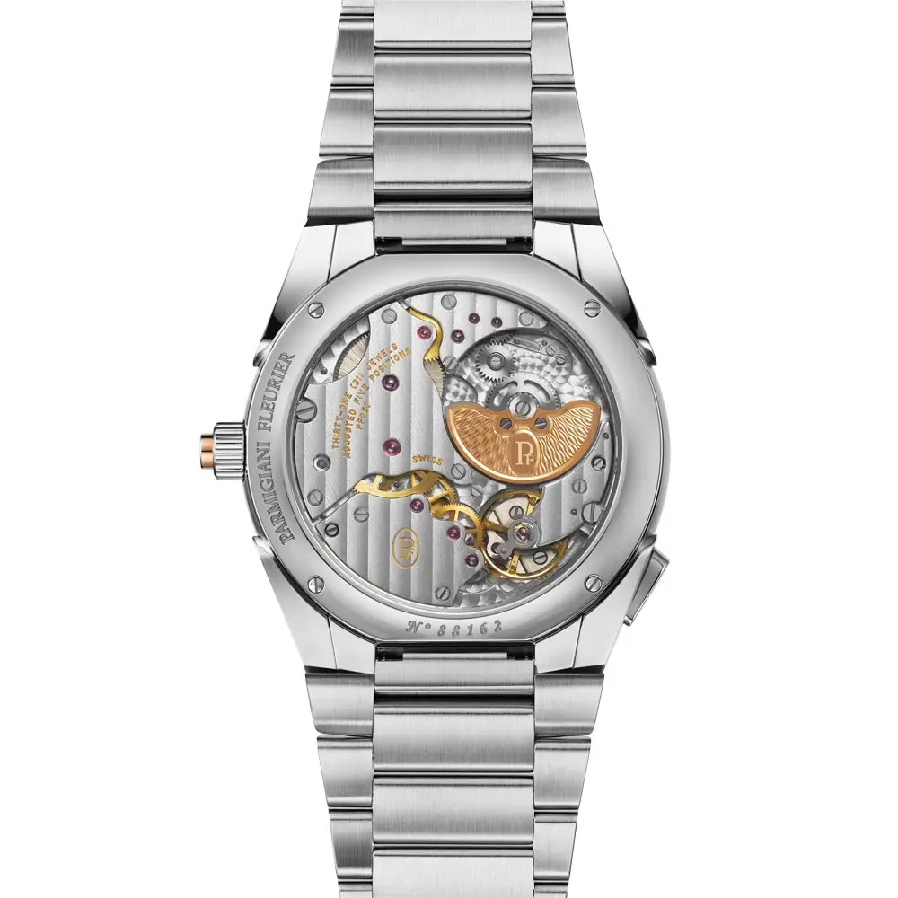 В основе часов – автоматический калибр PF051 с запасом хода 48 часов. Инновационная функция GMT Rattrapante позволяет отслеживать два часовых пояса одновременно – по нажатию кнопки вторая стрелка элегантно скрывается под основной. Прозрачная задняя крышка из сапфирового стекла открывает вид на изысканную отделку механизма, включая ротор из 22-каратного золота.