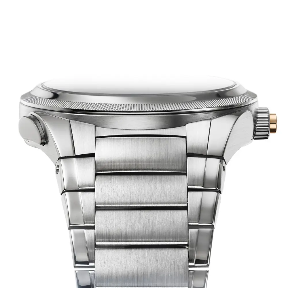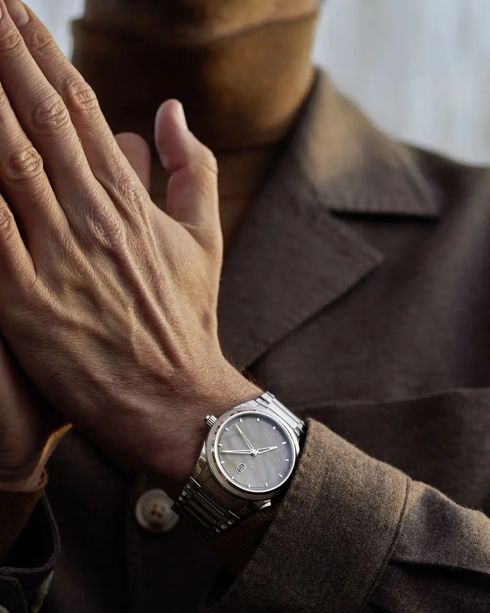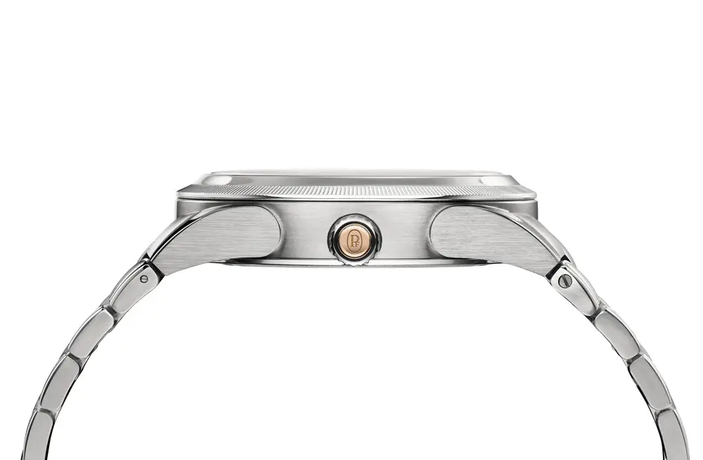 Элегантный 40-миллиметровый корпус из полированной стали дополнен люнетом из платины 950 пробы и циферблатом с ручным гильошированием цвета "песочный серый". Все это дополнено встроенным стальным механизмом и сапфировым стеклом с антибликовым покрытием.