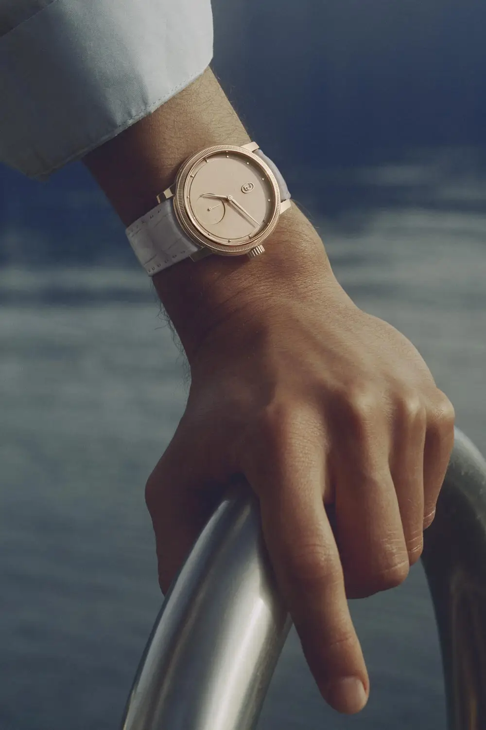 Модель дополняет ремешок из нубукового аллигатора цвета «Sand Gold» с застёжкой из розового золота. Толщина корпуса всего 8,8 мм, водонепроницаемость 30 м – это изысканный аксессуар для ценителей традиционного мастерства и современной элегантности.