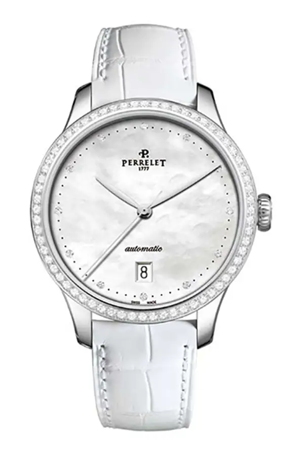 Женские часы Perrelet, входящие в коллекцию First Class, отличаются элегантным и тонким исполнением, что делает их идеальным отражением чувствительной и нежной женской души. Циферблат, установленный в стальной корпус, оснащен указателем даты и аналоговым циферблатом, украшенным бриллиантами. Они также украшают люнет, который прекрасно дополняет белый кожаный ремешок.