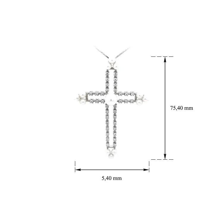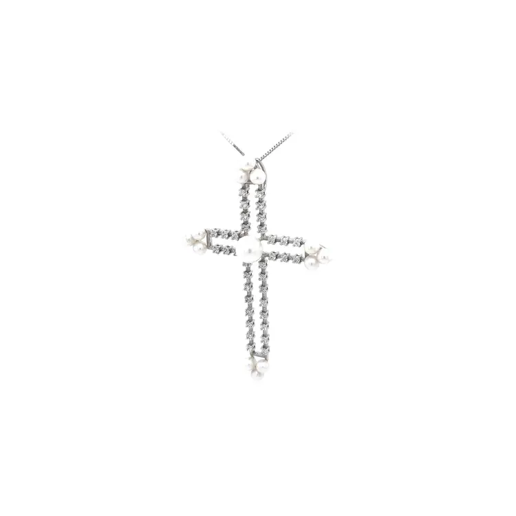 Подвеска Крест с жемчугом и цирконами из белого золота